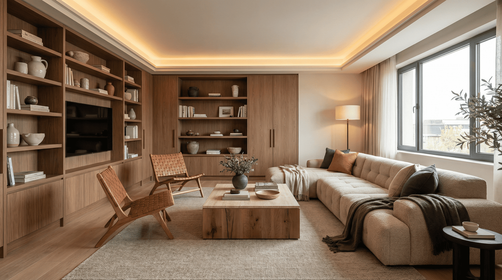 يعبر هذا التصميم عن غرفة معيشة عصرية متوازنة بدقة، حيث تلتقي الوظيفية العملية بالجماليات