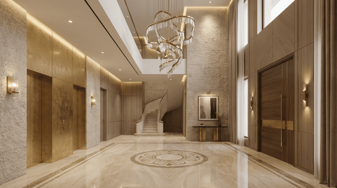 ●اللمسات الذهبية والنحاسية: تظهر في أبواب المصاعد وإطارات الأثاث، وهي خامات