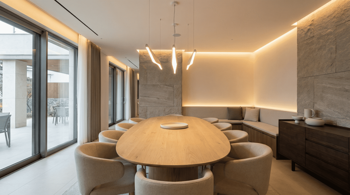 تعمل الإضاءة المتدلية فوق الطاولة كعنصر محوري في التصميم وليس مجرد مصدر للضوء:‌‌